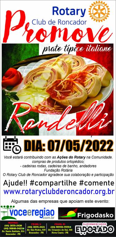 O Rotary Club de Roncador está promovendo a seunda edição da ação "RONDELLI", prato típico de massas a moda italiana para o próximo dia 07/05, com a finalidade de arrecadar fundos para a compra de produtos ortopédicos, andadores, cadeiras de banho e outros, além de uma parte que será destinado à Fundação Rotaria a qual mantém projetos distritais e globais.