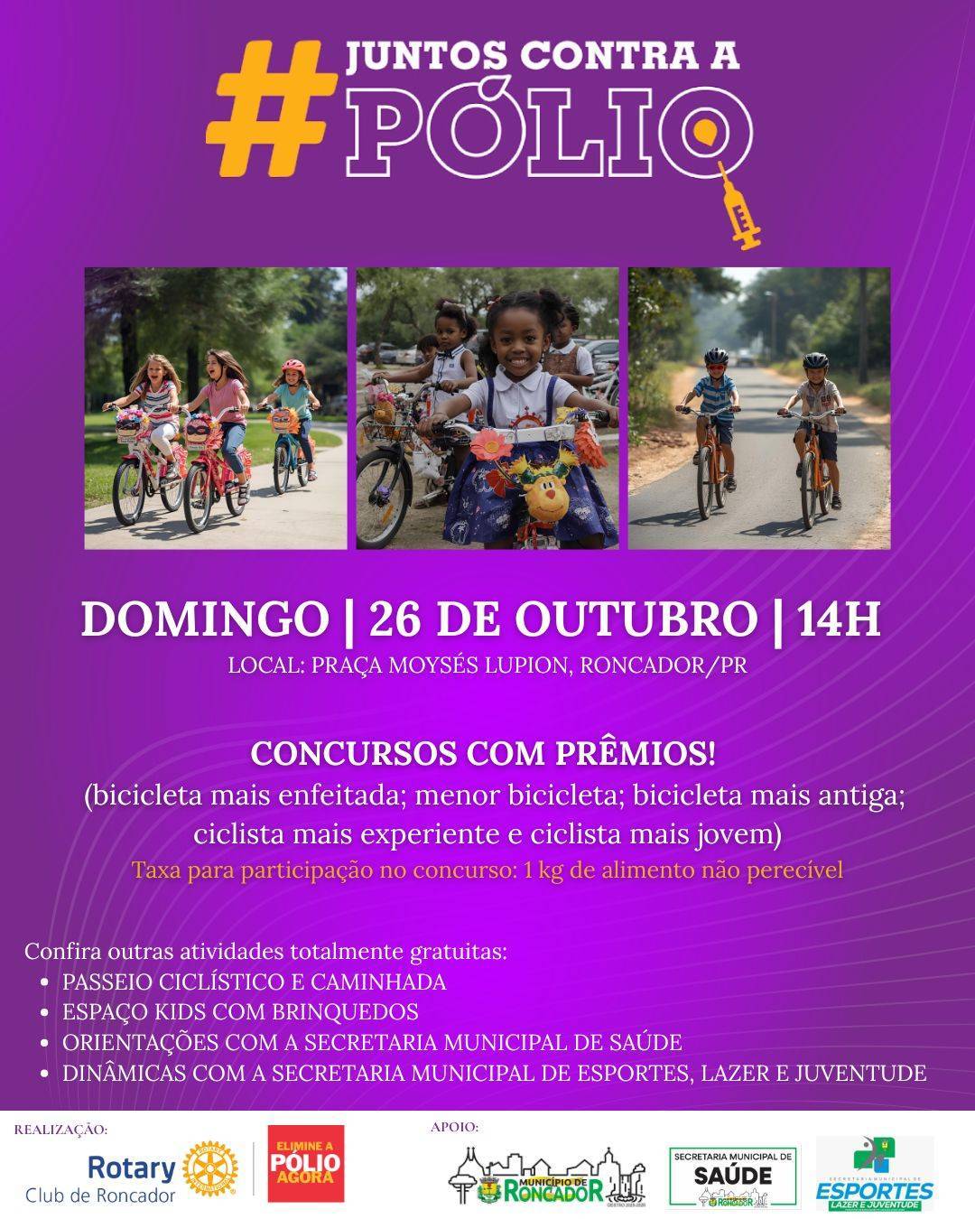 No domingo, 26 de outubro, a partir das 14h, a Praça Moyses Lupion, em Roncador/PR, será o ponto de encontro para o “Pedalando Contra a Pólio”, uma iniciativa do Rotary Club de Roncador em apoio à campanha global “Elimine a Pólio Agora”.